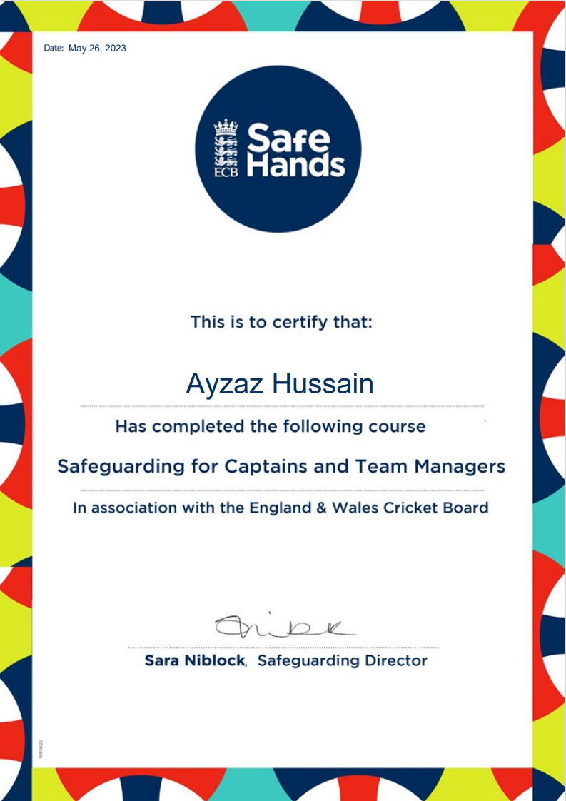 Ensuring all people who work in cricket at, or for, our club (such as staff, officials, volunteers, team managers, coaches and so on) have a responsibility for safeguarding children, and understand how the “Safe Hands Policy” applies to them.
