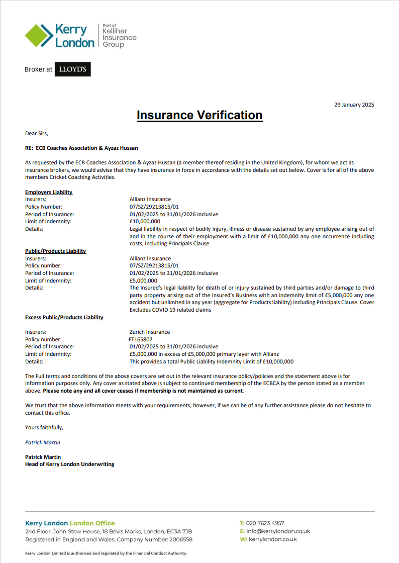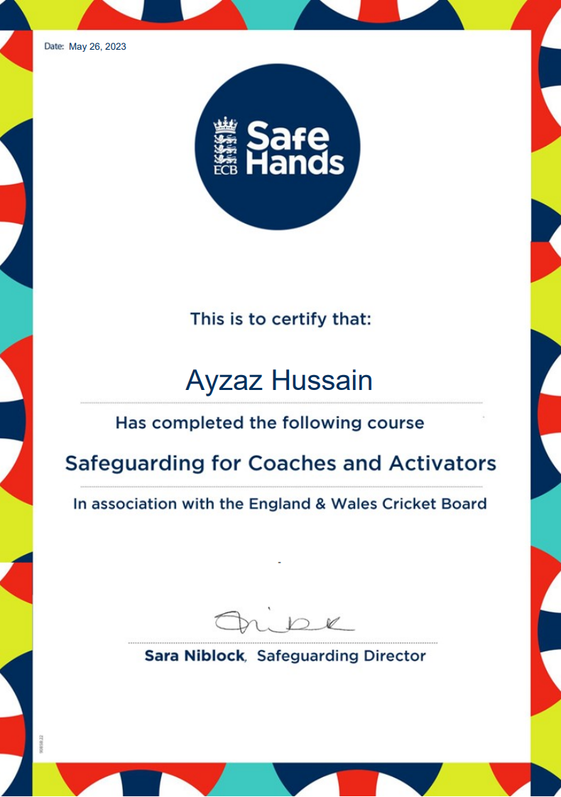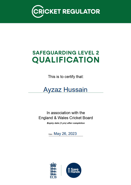 Ensuring all people who work in cricket at, or for, our club (such as staff, officials, volunteers, team managers, coaches and so on) have a responsibility for safeguarding children, and understand how the “Safe Hands Policy” applies to them.